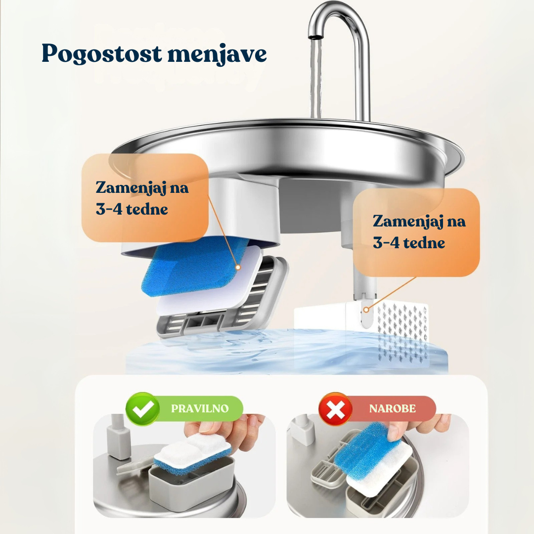 Uporaba je preprosta: pred prvo uporabo filter za dve minuti namoči v vodo, nato ga vstavi v fontano. Za optimalno delovanje priporočamo menjavo filtra vsakih 3–4 tedne.