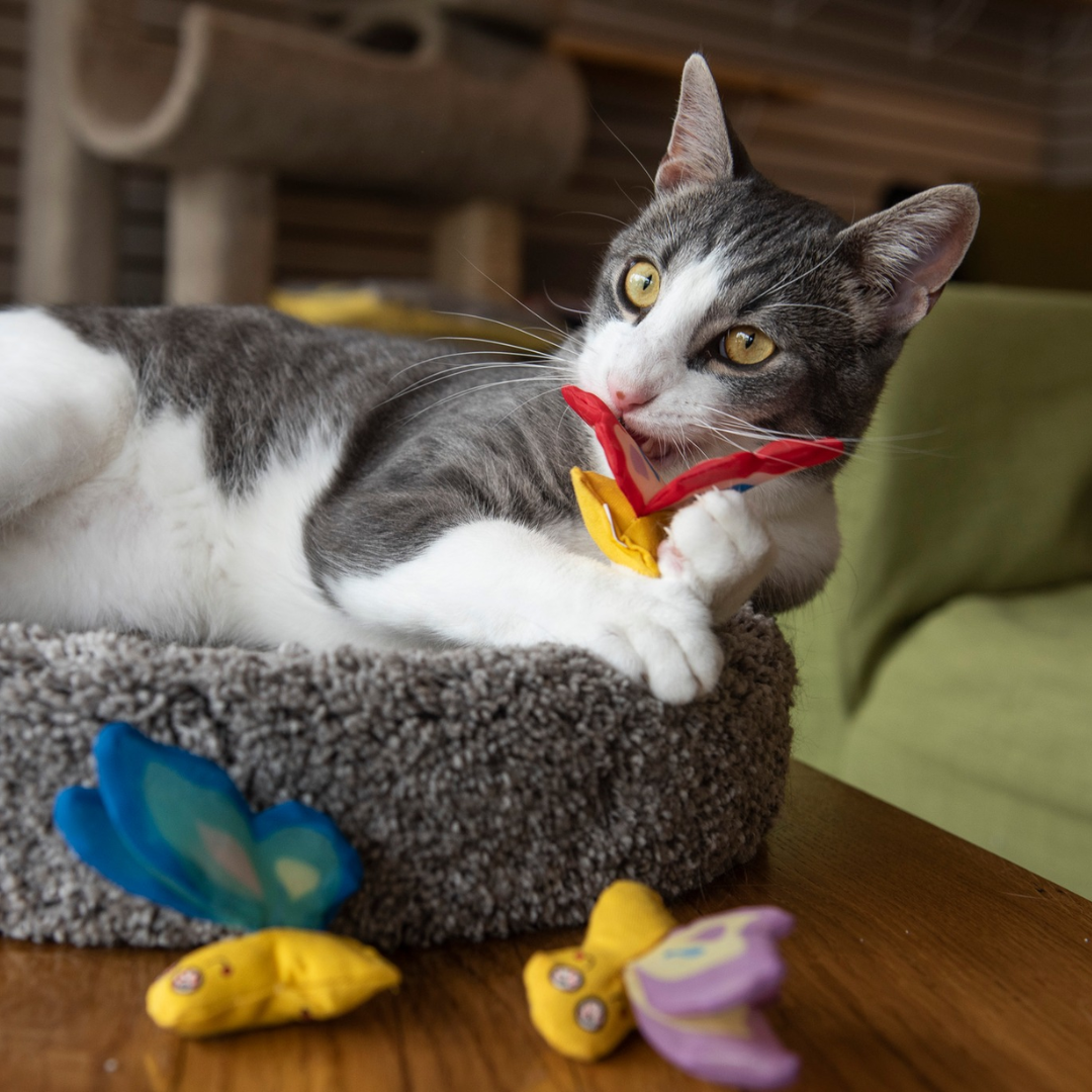 Iščeš igračo, ki tvojo mačko takoj dvigne na tačke? Yeowww! metuljček z mačjo meto združuje tri stvari, ki mačke spravijo v “zoomies”: močno aromo 100% organske mačje mete, šumeča krilca, ki prebudijo plenilski nagon, in trpežno tkanino, ki zdrži praskanje, grizenje in brcanje. Kot pri vseh Yeowww! igračah je tudi tu polnilo izključno listi in cvetni vršički mačje mete (tam je največ eteričnih olj), zato je vonj izrazito močan in obstojen. Brez bombažnih ali penastih polnil, brez plastičnih delov in brez “toy-grade” mešanic – samo čista kakovost, zaradi katere je Yeowww! sinonim za najbolj “nore” igrače z mačjo meto.