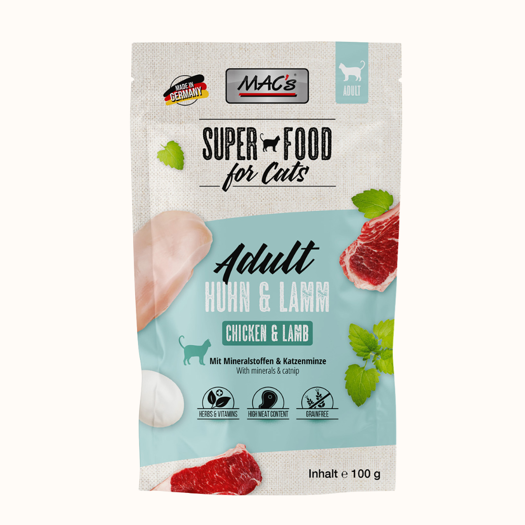 Če iščeš obrok, ki združuje čist mesni profil, visoko prebavljivost in resnično odličen okus, je MAC’s cat Piščanec & Jagnjetina (100 g) odlična izbira. Vrečka prinaša idealno ravnovesje med pustim piščančjim mesom in hranilno jagnjetino, zato bo tvoja mačka dobila obilje kakovostnih živalskih beljakovin brez nepotrebnih polnil.