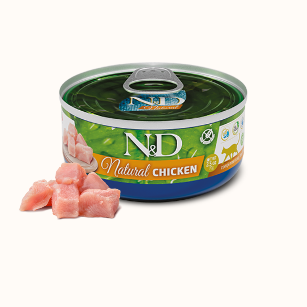 N&D Can Cat Natural Chicken 70 g je kakovostna dopolnilna mokra hrana za mačke, pripravljena po prehranski filozofiji Farmina Natural & Delicious, ki temelji na bioloških potrebah mesojedih živali. Recept vsebuje kar 70 % piščančjega fileja, ki predstavlja naraven vir lahko prebavljivih beljakovin in podpira zdravo mišično maso.