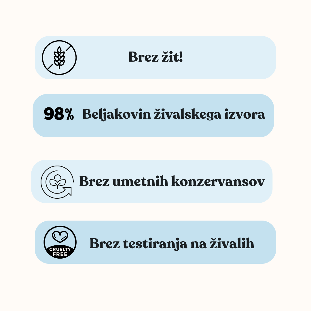 ✅ Brez žit in GSO – brez riža, koruze, soje, leče ali nepotrebnih polnil.