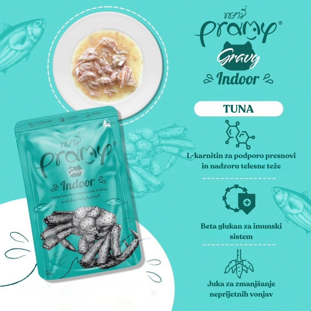 Pramy Indoor Tuna s prelivom iz rakovih palčk v omaki je posebej formulirana mokra hrana za mačke, ki večino časa preživijo v zaprtih prostorih in imajo zato nižje energijske potrebe.