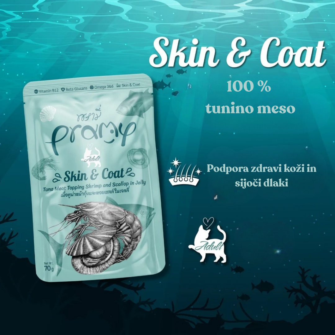 Pramy Skin&Coat Tuna s škampi in pokrovačo v želeju je skrbno oblikovana dopolnilna mokra hrana, ki združuje 100 % belo tunino meso, primerno za človeško prehrano, ter okusne škampe in pokrovače, bogate z naravnimi hranili in morskimi beljakovinami.