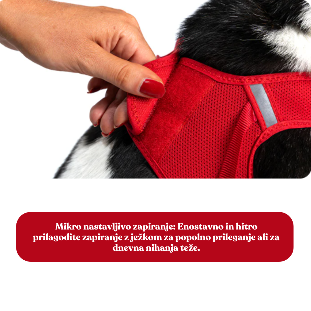Za varnost in zanesljivost poskrbi BUCKLEBONE® sponka, ena najmočnejših stranskih sponk v industriji, skupaj z nerjavečim D-obročkom za varno pritrditev povodca. Mikro-nastavljivo zapiranje z ježkom omogoča natančno prilagoditev obsegu prsnega koša.