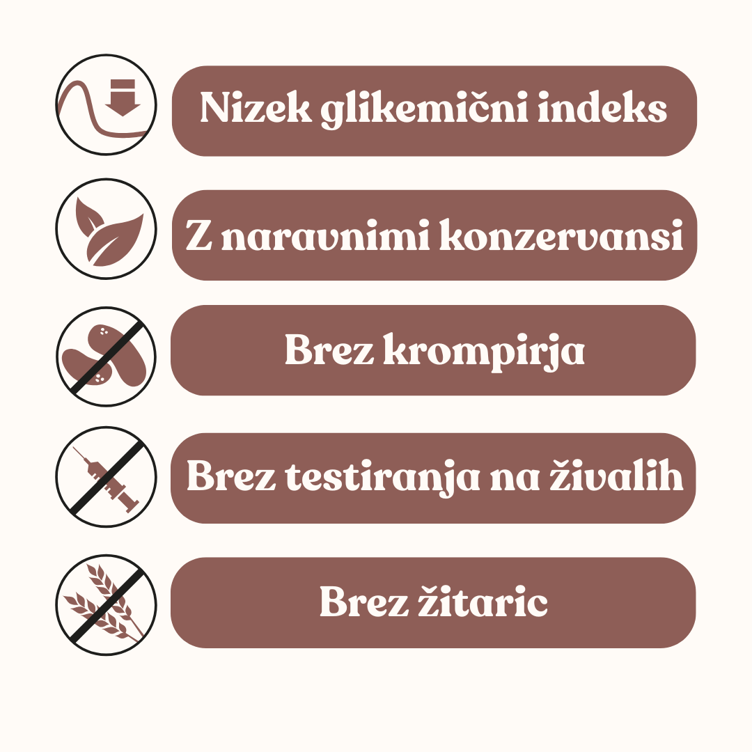 ✅ Brez umetnih barvil, arom, konzervansov in brez testiranja na živalih.
